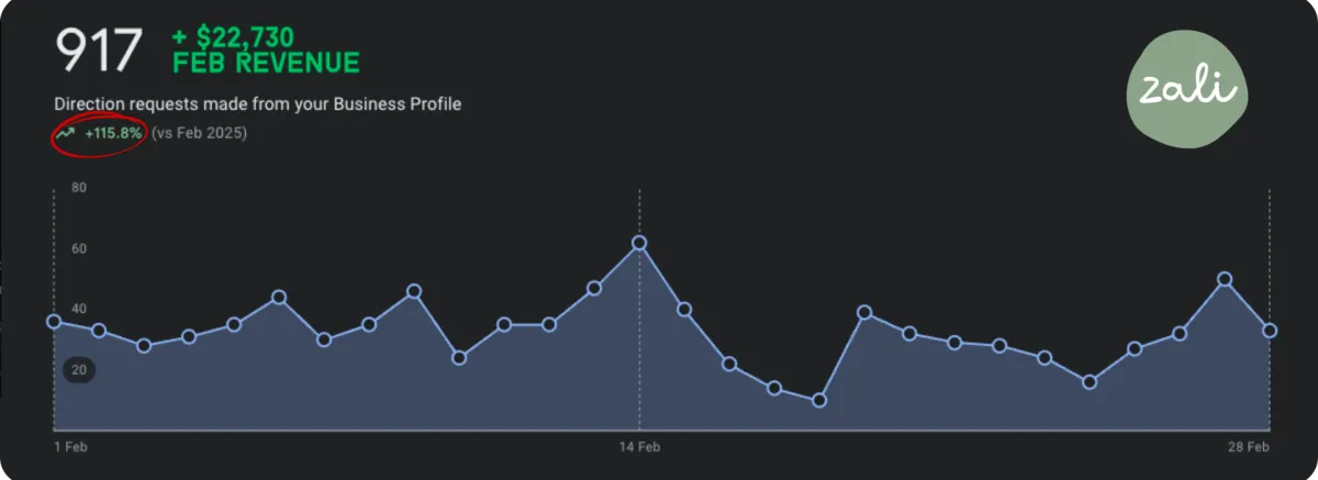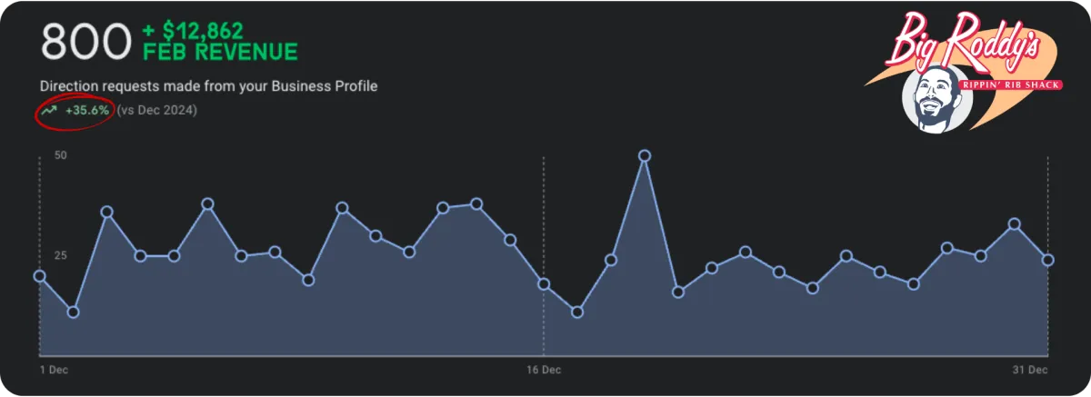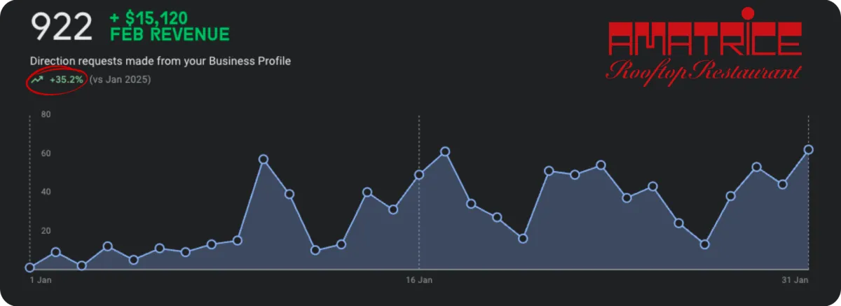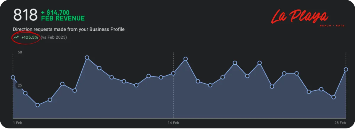 It depends on where you're starting, but our clients typically see a measurable increase in direction requests, calls, and website clicks within the first few months. For context, La Playa saw a 105% increase in direction requests and an estimated $14,700 in additional monthly revenue.