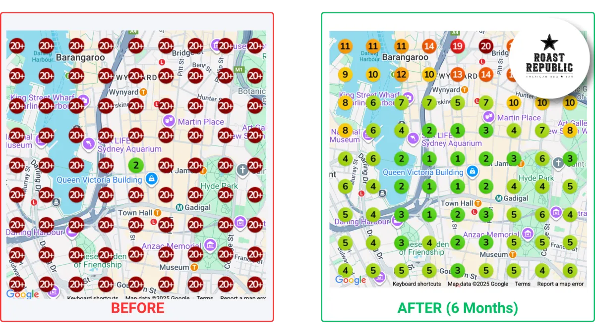 We'll run a geo grid of your area showing exactly where you rank on Google Maps for your key search terms, compared to your competitors. You'll see a visual map of where you're visible and where you're invisible — and where your competitors are beating you.